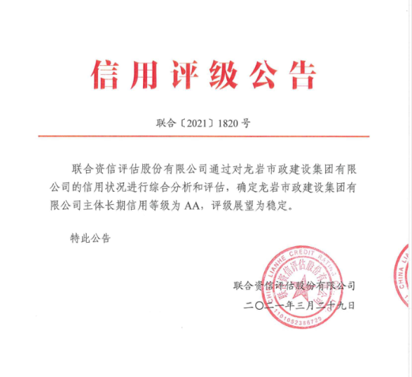 2021年3月29日,經(jīng)國(guó)內(nèi)權(quán)威評(píng)級(jí)機(jī)構(gòu)聯(lián)合資信評(píng)估有限公司評(píng)級(jí)專家集體分析、研究、決議,一致通過給予龍巖市政建設(shè)集團(tuán)有限公司AA主體信用評(píng)級(jí),評(píng)級(jí)展望穩(wěn)定。