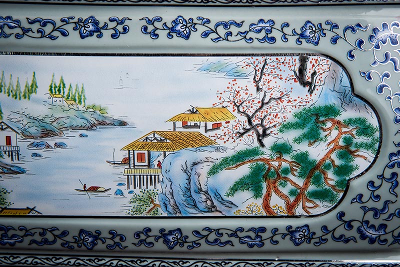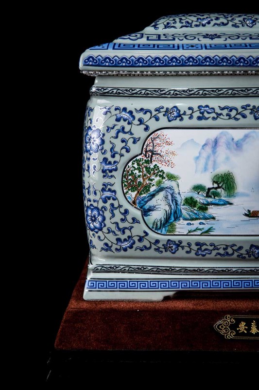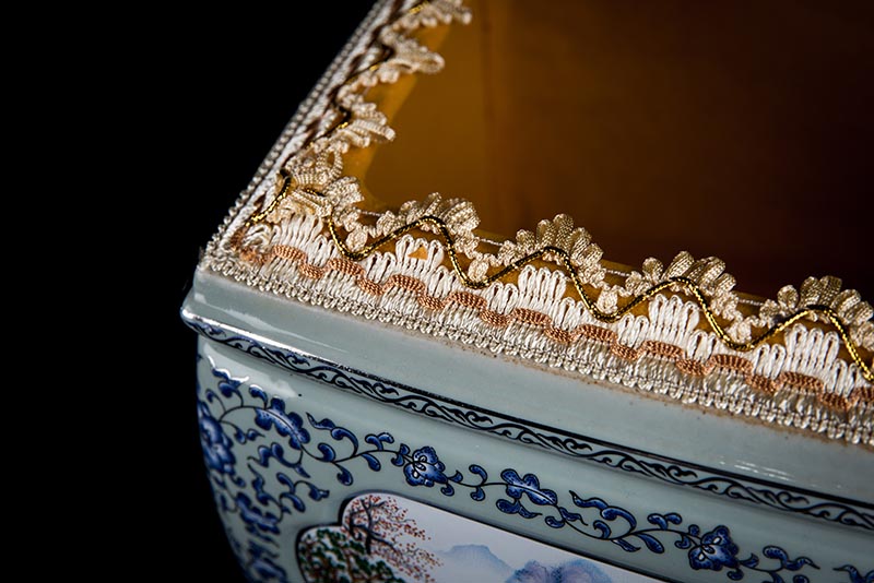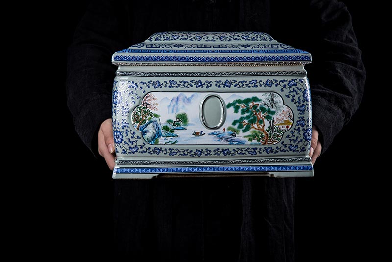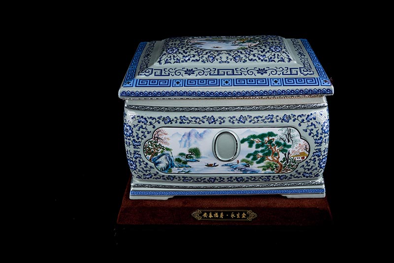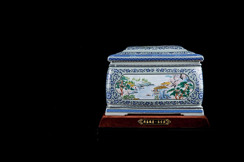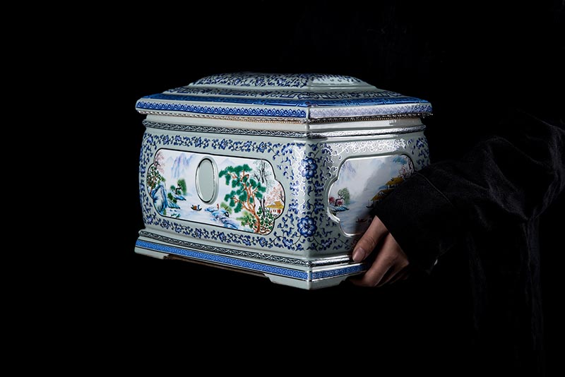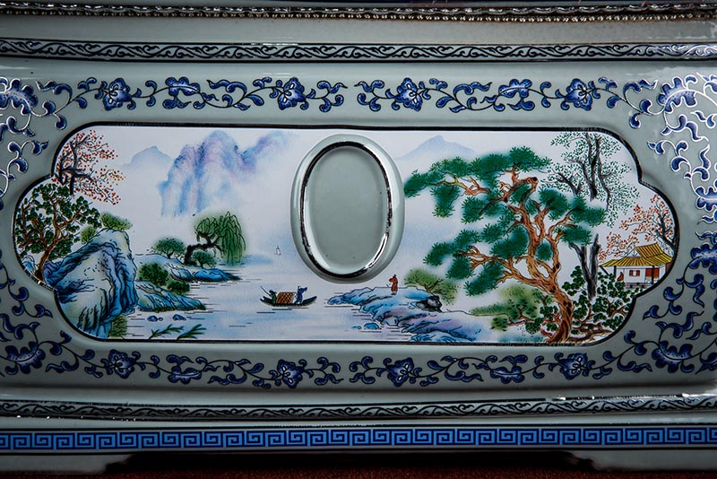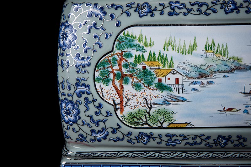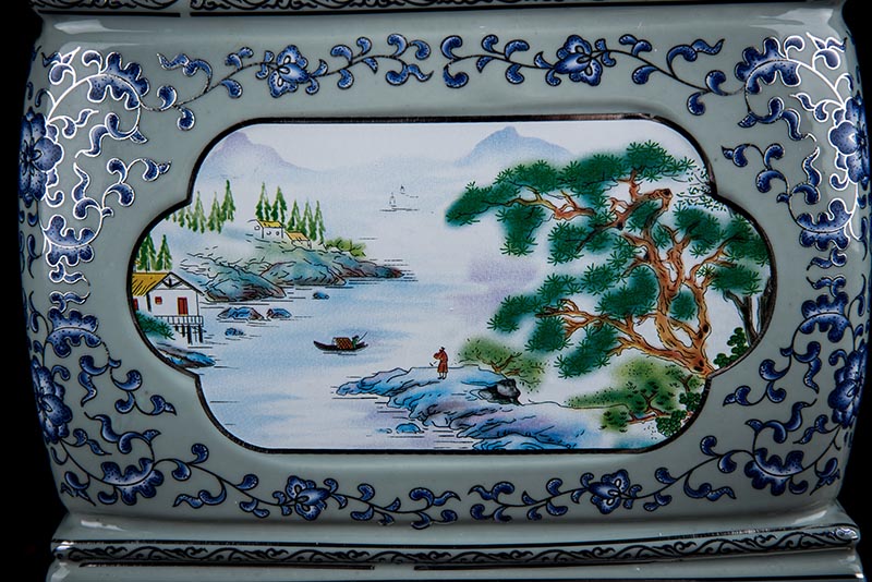 這款產(chǎn)品采用了青花粉彩工藝,既有景德鎮具特色的青花,又有山水,景德鎮民間稱(chēng)之為“開(kāi)窗山水”很多工藝品都會(huì )運用上,讓許多文人墨客忍不住注目觀(guān)看。我們可以看到這款產(chǎn)品圖片上青花與山水搭配巧妙,纏枝蓮紋環(huán)環(huán)相扣,寓意后世枝繁葉茂,代代繁榮。尺寸:340x230x250mm